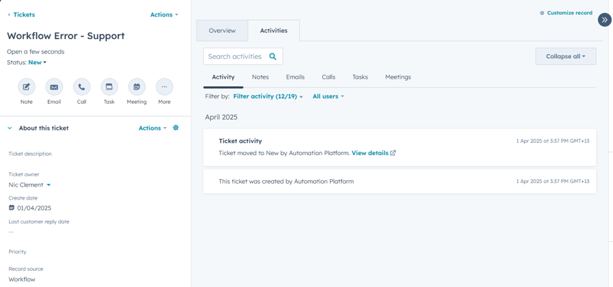 Action: Automatically create a support ticket in HubSpot's Service Hub when a sync error occurs.
